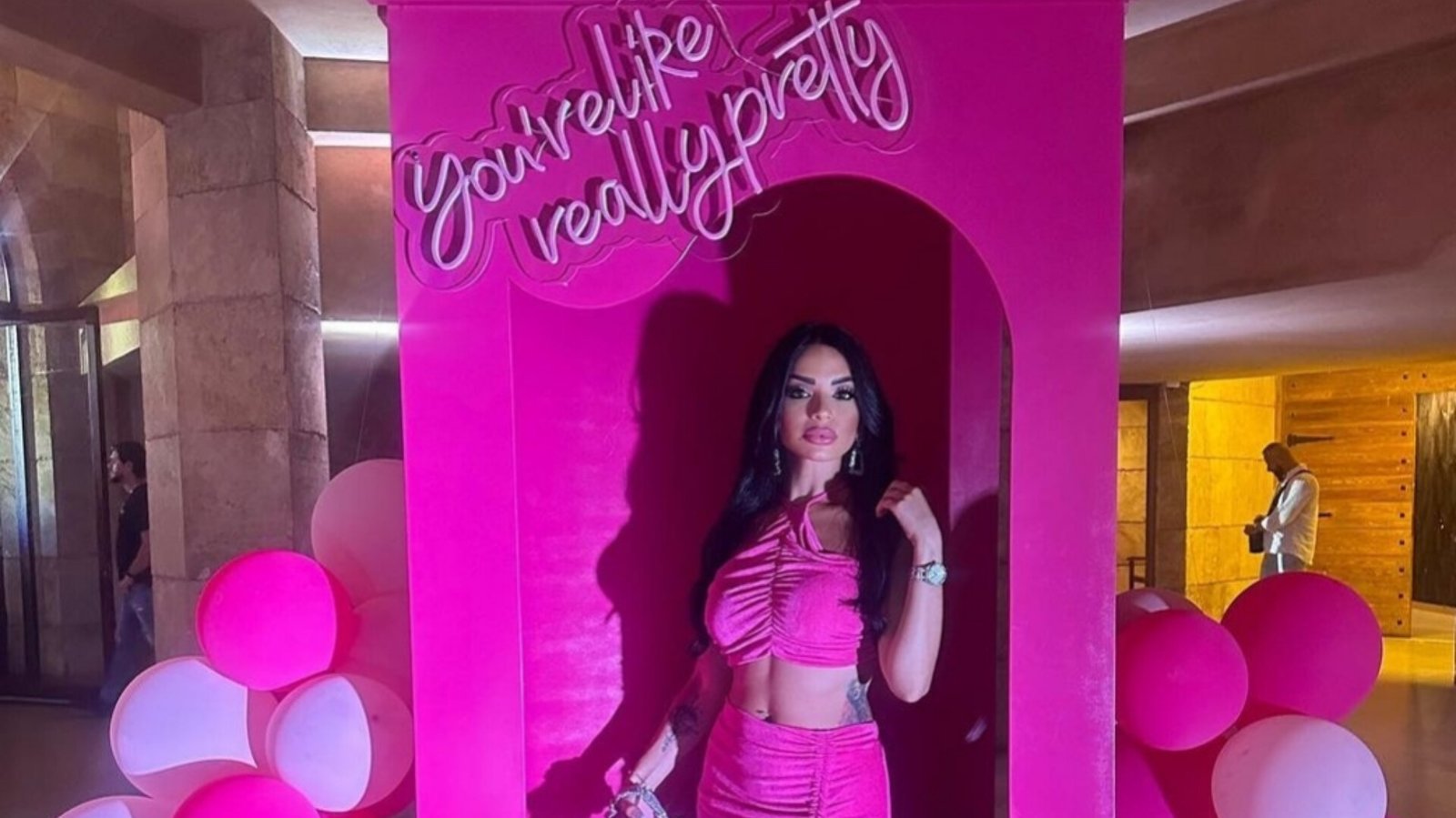 ظهرت نادين في الصور وهي تبتكر إطلالة رائعة باستخدام ألوان مشرقة ولمسات خاصة، تجسد أسلوب باربي الرائع والأنثوي. تميز المكياج الجريء والمبدع الذي قامت به نادين بتحديد ملامح وجهها ببراعة وتسليط الضوء على جمالها الطبيعي.